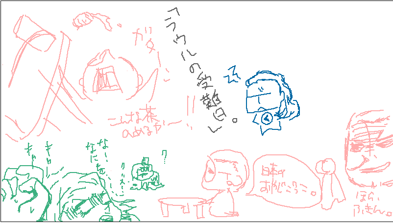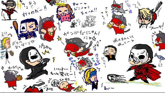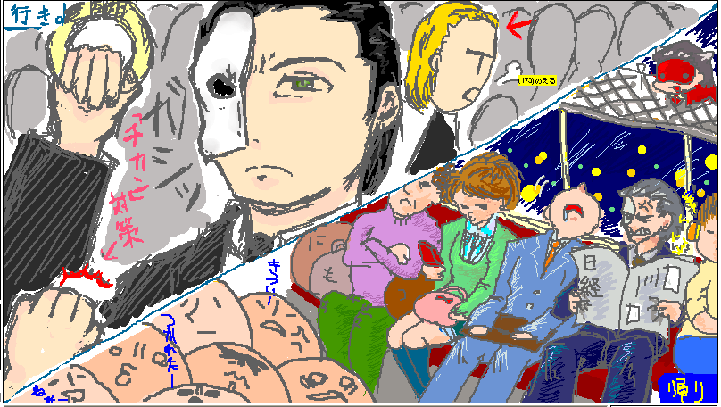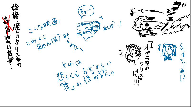 × [PR]上記の広告は3ヶ月以上新規記事投稿のないブログに表示されています。新しい記事を書く事で広告が消えます。 下の続き想像絵。 今回は満員電車で『行き』のマスタと『帰り』のマスタ。 行きのマスタはのえるさん。帰りのマスタは管理人。 ラウル、社長という設定なのですが、通勤に電車使っているところがツボにきました^^ ナイスですよ!のえるさん!!庶民派ラウル最高です!!! 一方、管理人は右の人物より左に群れてるまるっこい彼らを書くのが一番おもしろかったりして(笑) それとネタ。電車の迷惑ネタ(笑) 二日間にわたり、絵茶参加させていただきました!本当に楽しかったです!!! またお誘いくださいまし~^^ こちらからもお誘いさせてもらうかもです・・・(ドキドキ) のえるさん、響さん、お世話になりました~~~~~~~!!!! PR バイトの用事があったので遅れて参加させていただきました! なんだか私が訪問する前に細やかな設定が出来たらしく・・・ その設定を響さんから教えてもらい、鼻血ものでした(笑) グッジョブ!!!のえるさん!響さん!!! 上の絵がその想像絵。 サラリーマンマスタ=響さん その他人物、小物など=のえるさん、ほたる この前にもう一つ二人が描かれた絵があるのですが、管理人がパソの以上で落ちちゃったのでその後どのような絵に仕上がったか皆目検討がつきません・・・(泣) と、思ったら響さん宅にアップされてました!!ああ、神よ!!! ごらんになりたい方はどうぞどうぞ!よだれでますよ?(笑) ちょっとした手違いでミニサイズになってしまいました(切腹) 第四弾!!!! せくすぃなドンニャンを!(笑) というわけで画面中央に書かせていただいたのですが・・・ すみません、完璧なまでの管理人の技量不足ですorz せくすぃのかけらもない!!!!!! いやぁぁぁぁぁ・・・・!(失踪) はぁ・・・はぁ・・・(帰還) 画面上から伸びているマスタの手にクリスが捕まってしまいました(クリス気付いてないです^^) それを見て泣きじゃくるドンニャン。 そこから壮大な物語が広がる・・・・!!! (ここらへんからかなり頑張ってキーボードうちました^^;) そしてその話に乗ってくれたのえるさん、響さん、本当にありがとうございました!! もう一人でも寂しくないよ!! かなり黒いドンニャンになってしまって申し訳ない・・・! 楽しかったですー^^うきゃうきゃな時間でした! また是非誘ってくださいまし!!!飛びつきますんで!(笑) どうも響さん、のえるさん、ありがとうございましたー! 第二弾!! どんなテーマがいいか談話していたら「家庭用品と怪人」の話題が出てきました(笑) そして響さんが「ちゃぶ台をひっくり返す怪人」を書き上げてくれました。 正座している怪人がなんてキュートなんでしょう!!!! クリスがプリプリ怒ってるー!キュンvvvv お茶、ぶっ掛けられてます、うちのラウル。 かわいそうなラウルでごめんなさいorz このあとなかなか題材が決まらなくてとうとう「オペラ座座談会」が発足されました。 そのときもんのすごく有頂天だった自分を覚えています。。。恥ずかしい・・・ だってだってマスタばかりの会議だったんだもん!!(汗) うっかりすっかり興奮しちゃったよ!!! ちゃんと挙手して意見を述べてくれた響さんマスタが胸に来ました。 のえるさんのミニも・・・もう・・・!もう・・・!! なんでスクショとらなかったんだ!自分!!!(壁に頭をうちつける) このあと響さんからものすごい知恵袋を授かりました(´∀`) すごいよ!響さん!!!!! ピンク=響さん 青=のえるさん 変な緑=ほたる